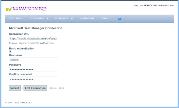 Enter the Connection URL to the TFS server and specify whether to use Basic authentication or not, in order to be able to connect to Microsoft Test Manager.