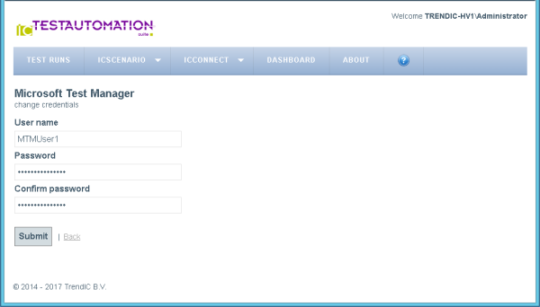 - Credentials - Click to open the Microsoft Test Manager change credentials page.